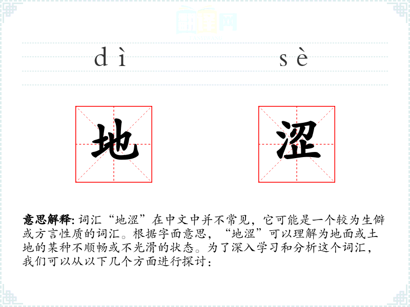 词汇“地涩”在中文中并不常见,它可能是一个较为生僻或方言性质的词汇。根据字面意思,“地涩”可以理解为地面或土地的某种不顺畅或不光滑的状态。为了深入学习和分析这个词汇,我们可以从以下几个方面进行探讨: