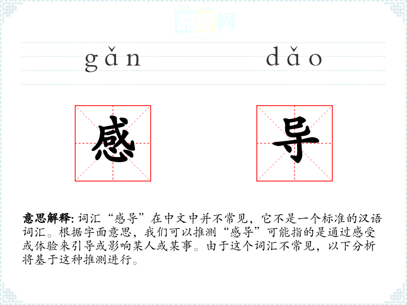 词汇“感导”在中文中并不常见,它不是一个标准的汉语词汇。根据字面意思,我们可以推测“感导”可能指的是通过感受或体验来引导或影响某人或某事。由于这个词汇不常见,以下分析将基于这种推测进行。