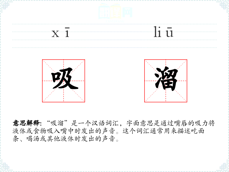 “吸溜”是一个汉语词汇,字面意思是通过嘴唇的吸力将液体或食物吸入嘴中时发出的声音。这个词汇通常用来描述吃面条、喝汤或其他液体时发出的声音。