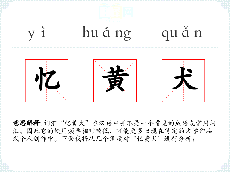 词汇“忆黄犬”在汉语中并不是一个常见的成语或常用词汇,因此它的使用频率相对较低,可能更多出现在特定的文学作品或个人创作中。下面我将从几个角度对“忆黄犬”进行分析: