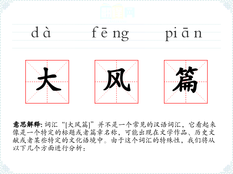 “大风”在汉语中是一个常见的词汇,指的是风力很大的风。而“篇”则是指文章或篇章。这个组合可能是后来在特定文学作品中创造出来的。