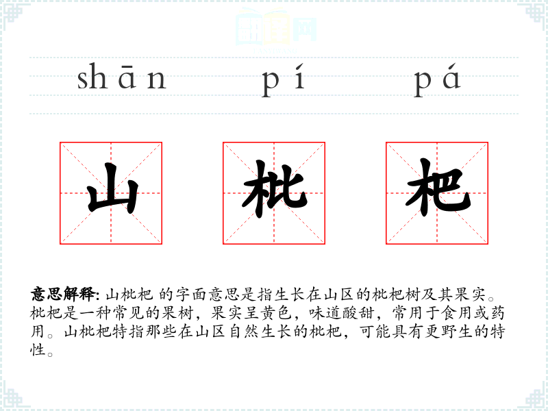 山枇杷 的字面意思是指生长在山区的枇杷树及其果实。枇杷是一种常见的果树,果实呈黄色,味道酸甜,常用于食用或药用。山枇杷特指那些在山区自然生长的枇杷,可能具有更野生的特性。