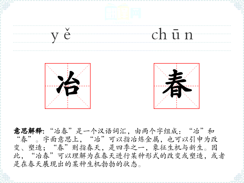 “冶春”是一个汉语词汇,由两个字组成:“冶”和“春”。字面意思上,“冶”可以指冶炼金属,也可以引申为改变、塑造;“春”则指春天,是四季之一,象征生机与新生。因此,“冶春”可以理解为在春天进行某种形式的改变或塑造,或者是在春天展现出的某种生机勃勃的状态。