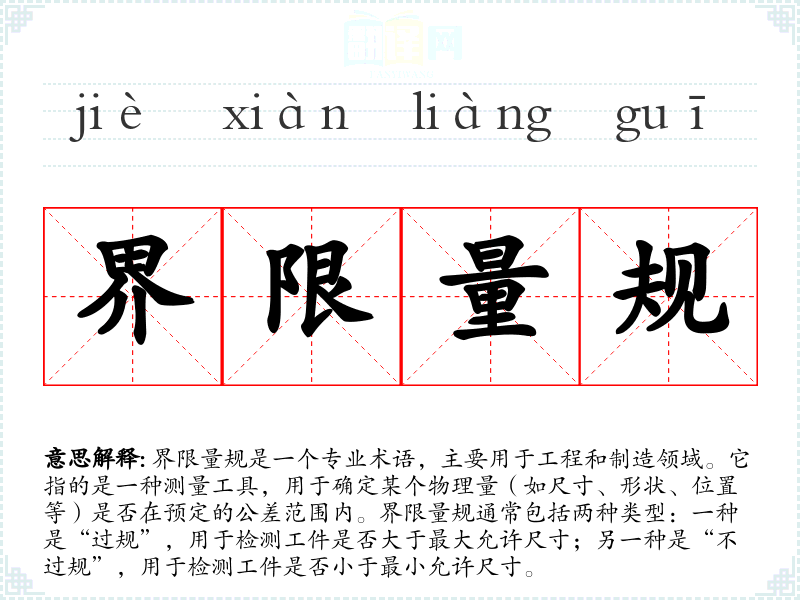 同义词:公差规、极限规、极限测量工具 反义词:非界限量规(指那些不用于检测极限尺寸的测量工具,如普通卡尺)