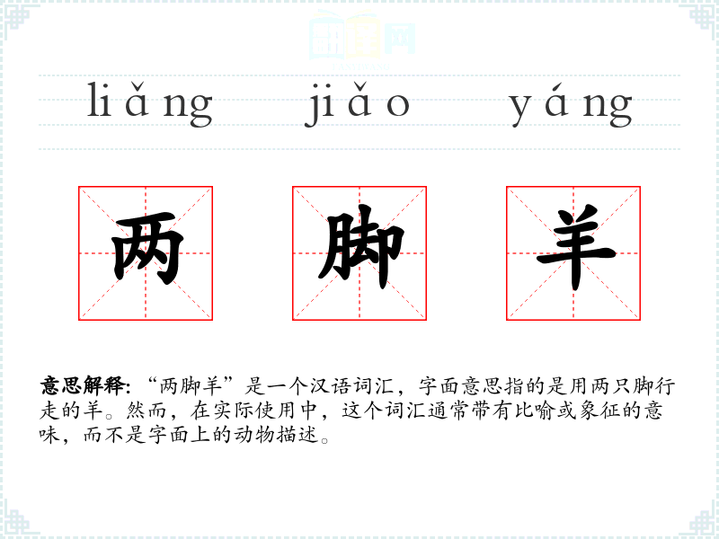 “两脚羊”是一个汉语词汇,字面意思指的是用两只脚行走的羊。然而,在实际使用中,这个词汇通常带有比喻或象征的意味,而不是字面上的动物描述。