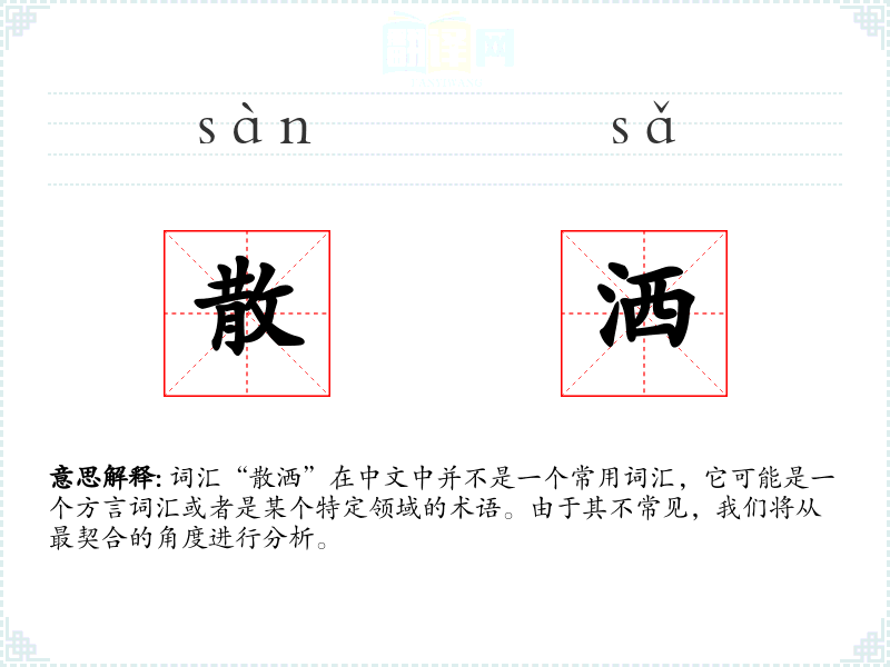 词汇“散洒”在中文中并不是一个常用词汇,它可能是一个方言词汇或者是某个特定领域的术语。由于其不常见,我们将从最契合的角度进行分析。
