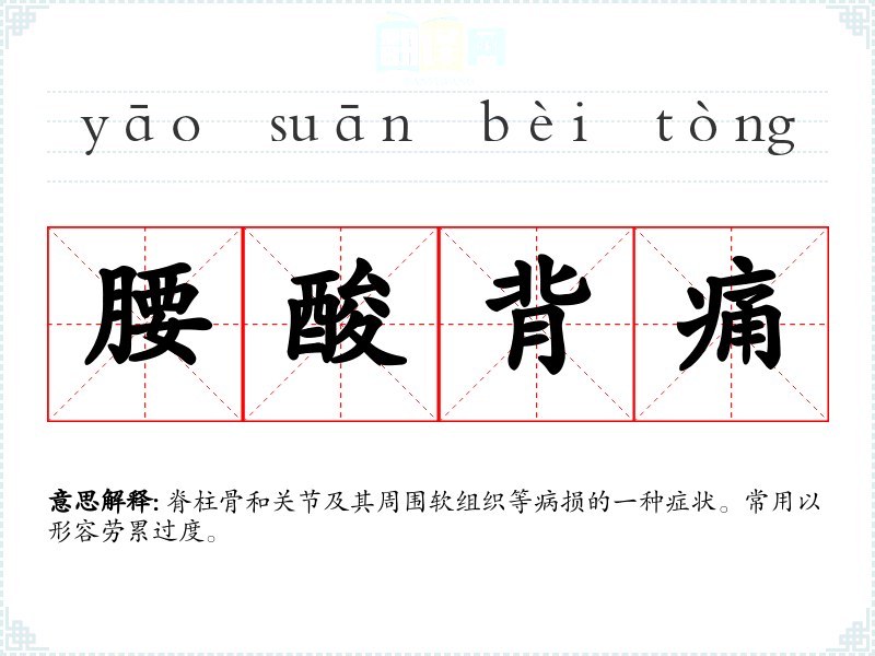 脊柱骨和关节及其周围软组织等病损的一种症状。常用以形容劳累过度。