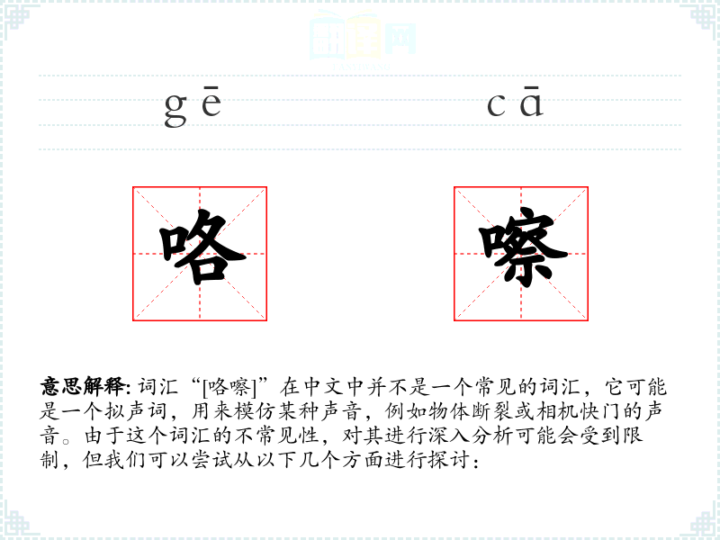 词汇“[咯嚓]”在中文中并不是一个常见的词汇,它可能是一个拟声词,用来模仿某种声音,例如物体断裂或相机快门的声音。由于这个词汇的不常见性,对其进行深入分析可能会受到限制,但我们可以尝试从以下几个方面进行探讨: