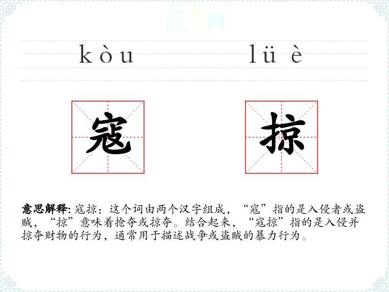 寇掠:这个词由两个汉字组成,“寇”指的是入侵者或盗贼,“掠”意味着抢夺或掠夺。结合起来,“寇掠”指的是入侵并掠夺财物的行为,通常用于描述战争或盗贼的暴力行为。
