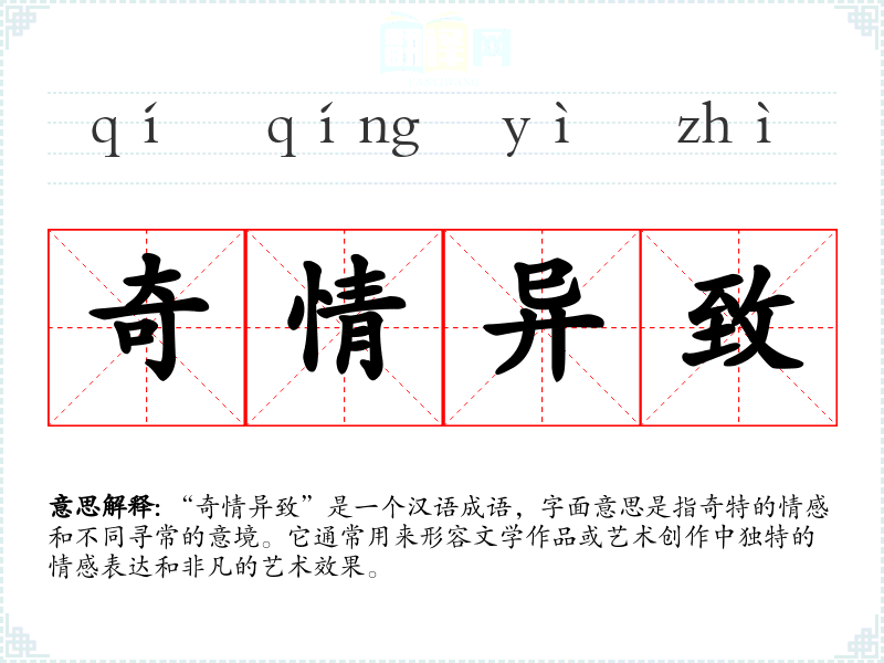 “奇情异致”是一个汉语成语,字面意思是指奇特的情感和不同寻常的意境。它通常用来形容文学作品或艺术创作中独特的情感表达和非凡的艺术效果。