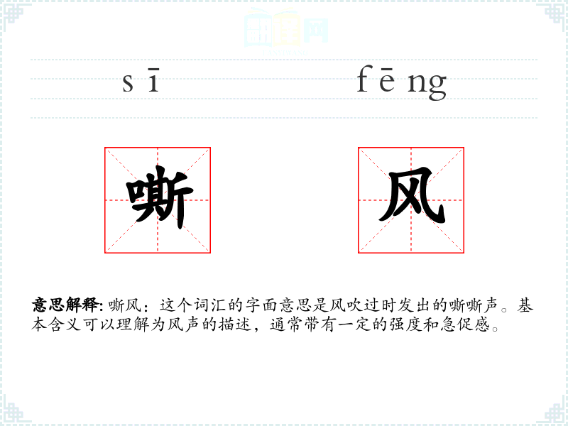 嘶风:这个词汇的字面意思是风吹过时发出的嘶嘶声。基本含义可以理解为风声的描述,通常带有一定的强度和急促感。