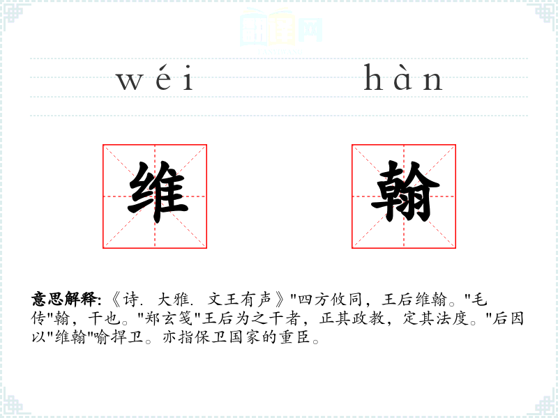 《诗.大雅.文王有声》"四方攸同,王后维翰。"毛传"翰,干也。"郑玄笺"王后为之干者,正其政教,定其法度。"后因以"维翰"喻捍卫。亦指保卫国家的重臣。