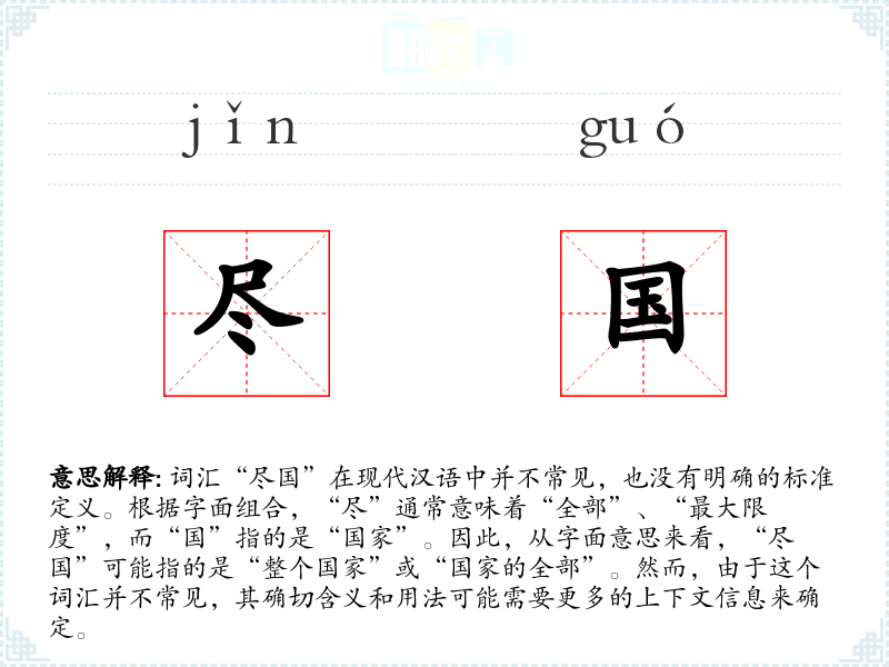 词汇“尽国”在现代汉语中并不常见,也没有明确的标准定义。根据字面组合,“尽”通常意味着“全部”、“最大限度”,而“国”指的是“国家”。因此,从字面意思来看,“尽国”可能指的是“整个国家”或“国家的全部”。然而,由于这个词汇并不常见,其确切含义和用法可能需要更多的上下文信息来确定。