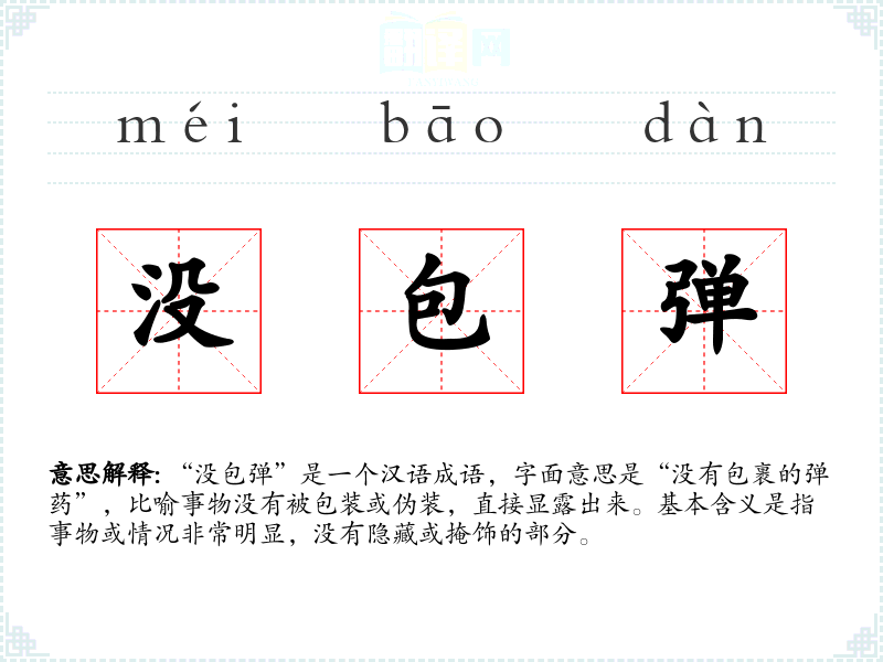 “没包弹”是一个汉语成语,字面意思是“没有包裹的弹药”,比喻事物没有被包装或伪装,直接显露出来。基本含义是指事物或情况非常明显,没有隐藏或掩饰的部分。