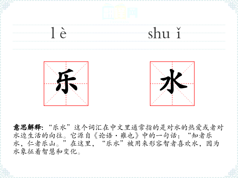 - 口语:在日常对话中,人们可能会用“乐水”来表达自己对水边活动的喜爱,如钓鱼、划船等。