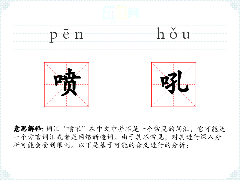 由于“喷吼”不是一个标准词汇,其词源和演变可能不明确。它可能是由“喷”和“吼”两个字组合而成的新词,用以形容一种强烈的表达方式。