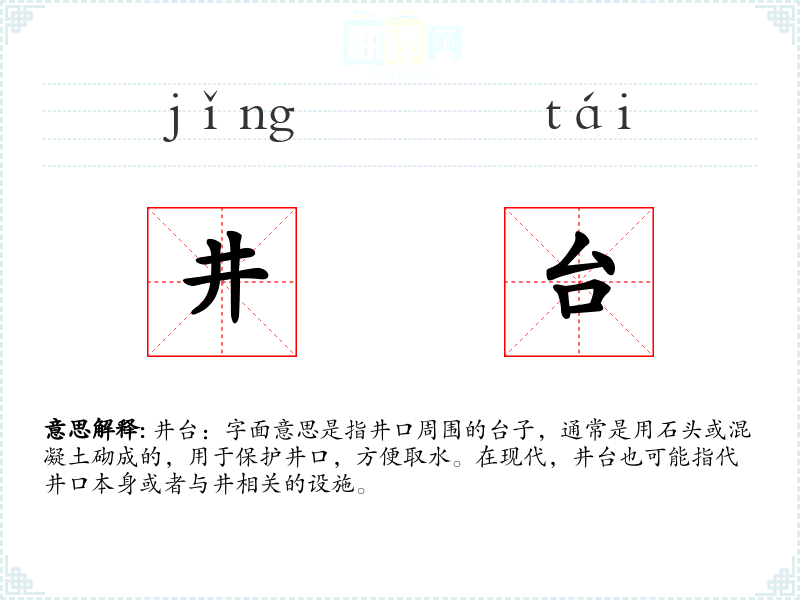 - 专业领域:在水利工程或农业领域,井台可能是一个专业术语,指代井口及其相关设施。