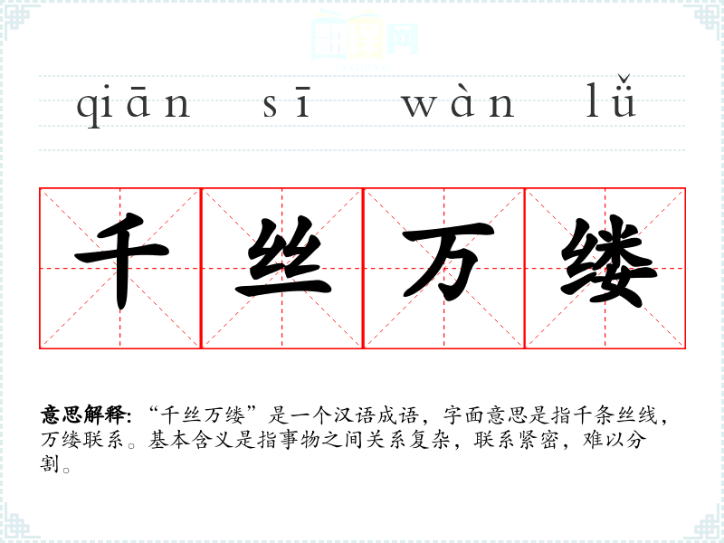 “千丝万缕”是一个汉语成语,字面意思是指千条丝线,万缕联系。基本含义是指事物之间关系复杂,联系紧密,难以分割。