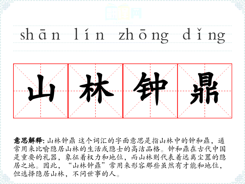 “山林钟鼎”这个词汇的词源可以追溯到**古代的隐逸文化。在古代,许多文人和士大夫因为政治斗争或个人理想,选择隐居山林,这些人的生活状态和精神追求被后人用“山林钟鼎”来概括。随着时间的推移,这个词汇逐渐被用来形容所有选择隐居生活的人。