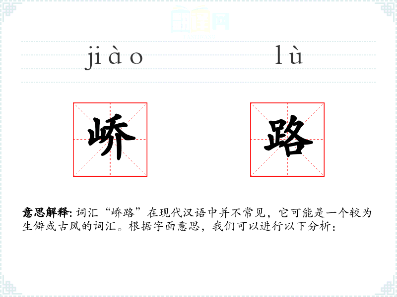 词汇“峤路”在现代汉语中并不常见,它可能是一个较为生僻或古风的词汇。根据字面意思,我们可以进行以下分析: