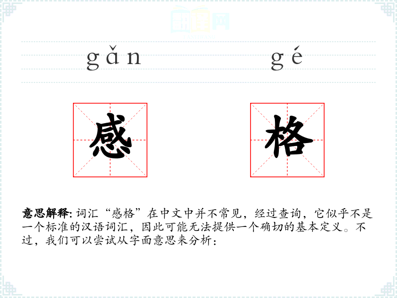 由于缺乏具体的信息和使用实例,我们无法对这个词汇进行深入的分析。如果“感格”是一个特定领域或特定文化中的术语,那么了解其背景和使用环境将是非常重要的。