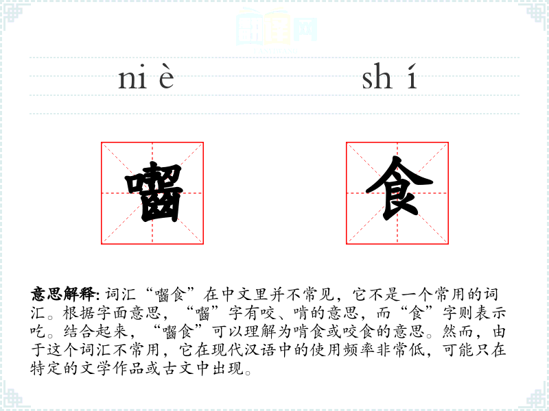 - 词源:“囓”字源自古代汉语,有咬的意思。