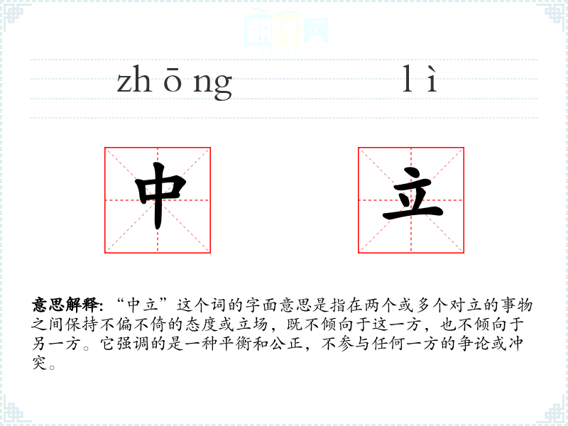 在不同语言中,“中立”的对应词汇可能有所不同,但其核心含义都是保持不偏不倚的态度。例如,在法语中,“neutre”与英语中的“neutral”相对应。