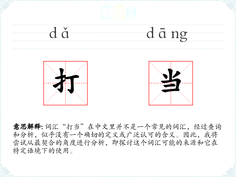 词汇“打当”在中文里并不是一个常见的词汇,经过查询和分析,似乎没有一个确切的定义或广泛认可的含义。因此,我将尝试从最契合的角度进行分析,即探讨这个词汇可能的来源和它在特定语境下的使用。