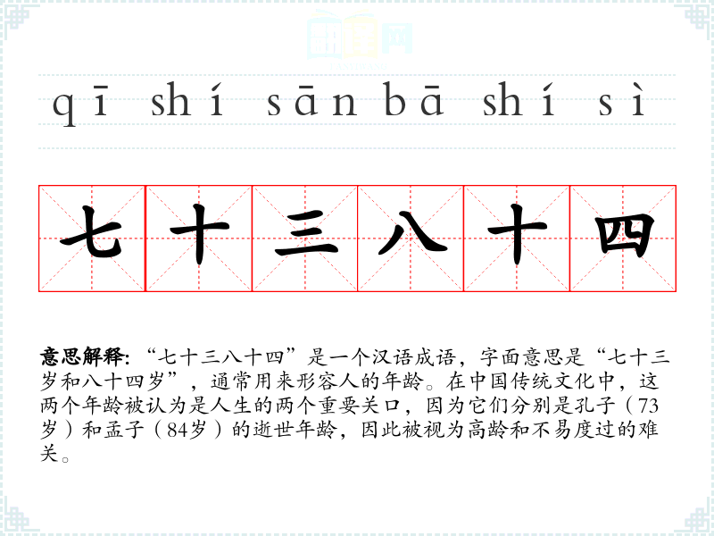 “七十三八十四”是一个汉语成语,字面意思是“七十三岁和八十四岁”,通常用来形容人的年龄。在**传统文化中,这两个年龄被认为是人生的两个重要关口,因为它们分别是孔子(73岁)和孟子(84岁)的逝世年龄,因此被视为高龄和不易度过的难关。