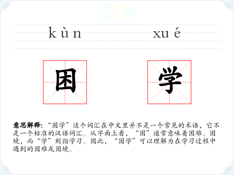 “困学”这个词汇在中文里并不是一个常见的术语,它不是一个标准的汉语词汇。从字面上看,“困”通常意味着困难、困境,而“学”则指学习。因此,“困学”可以理解为在学习过程中遇到的困难或困境。