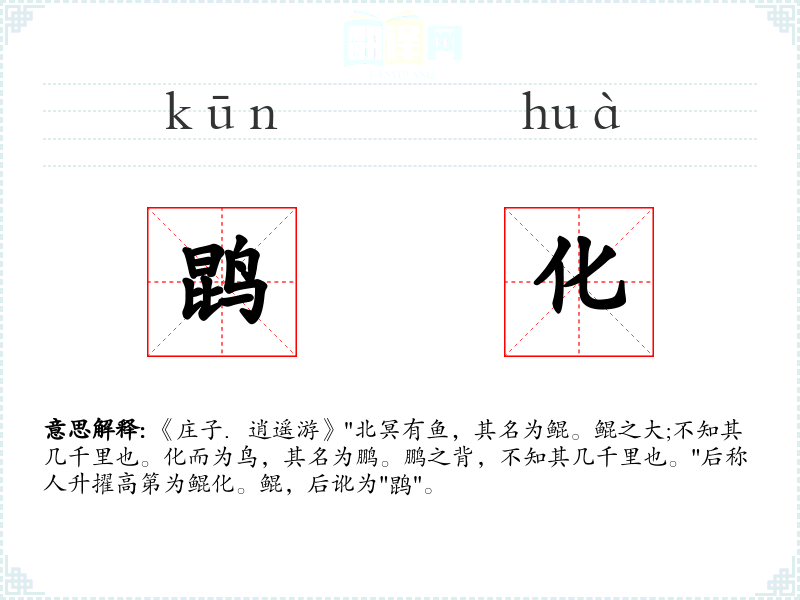 《庄子.逍遥游》"北冥有鱼,其名为鲲。鲲之大;不知其几千里也。化而为鸟,其名为鹏。鹏之背,不知其几千里也。"后称人升擢高第为鲲化。鲲,后讹为"鹍"。
