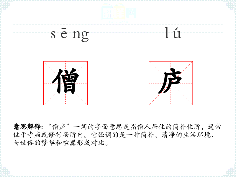 “僧庐”一词的字面意思是指僧人居住的简朴住所,通常位于寺庙或修行场所内。它强调的是一种简朴、清净的生活环境,与世俗的繁华和喧嚣形成对比。