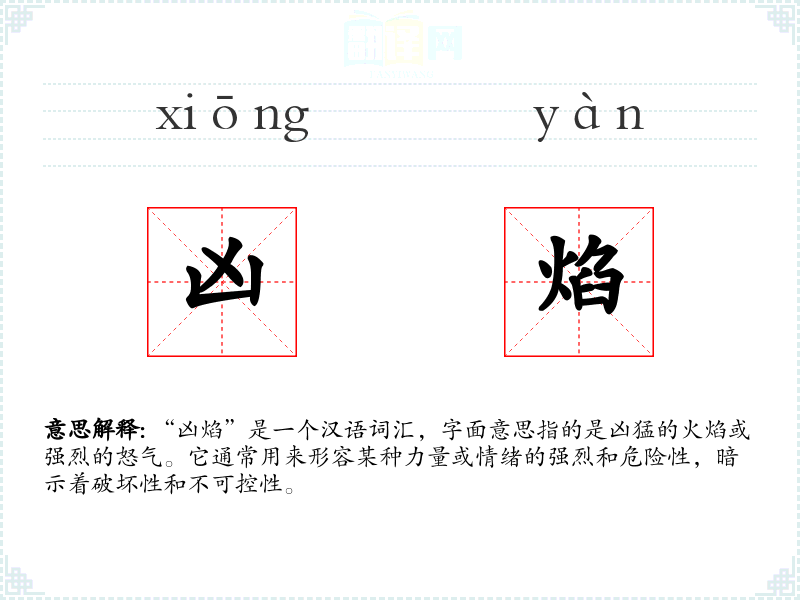 “凶焰”一词源于古代汉语,其中“凶”字意为不吉利或危险,“焰”字则指火焰。随着时间的推移,这个词的含义逐渐固定,主要用于形容强烈的、具有破坏性的力量或情绪。