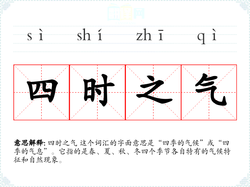 四时之气 这个词汇的字面意思是“四季的气候”或“四季的气息”。它指的是春、夏、秋、冬四个季节各自特有的气候特征和自然现象。