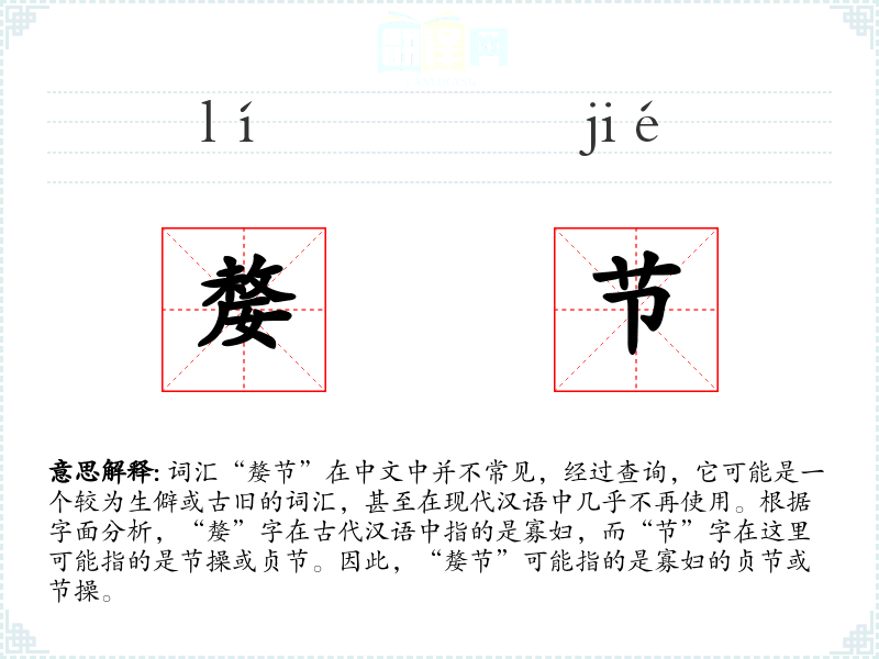 词汇“嫠节”在中文中并不常见,经过查询,它可能是一个较为生僻或古旧的词汇,甚至在现代汉语中几乎不再使用。根据字面分析,“嫠”字在古代汉语中指的是寡妇,而“节”字在这里可能指的是节操或贞节。因此,“嫠节”可能指的是寡妇的贞节或节操。