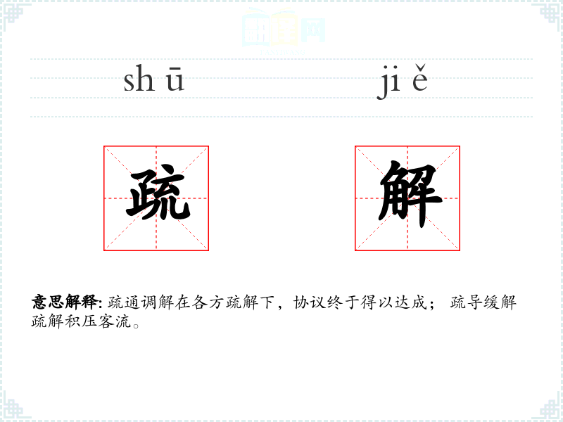 疏通调解在各方疏解下,协议终于得以达成; 疏导缓解疏解积压客流。