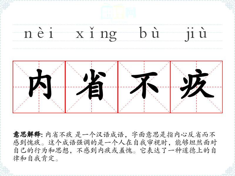 内省不疚 这个成语在语言学和表达中具有重要性,它不仅体现了个人道德修养,也是一种积极的自我表达方式。通过学和使用这个成语,可以更好地理解和传达个人的道德立场和内心状态。