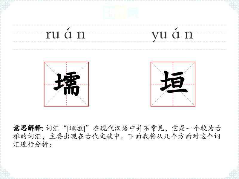 词汇“[壖垣]”在现代汉语中并不常见,它是一个较为古雅的词汇,主要出现在古代文献中。下面我将从几个方面对这个词汇进行分析:
