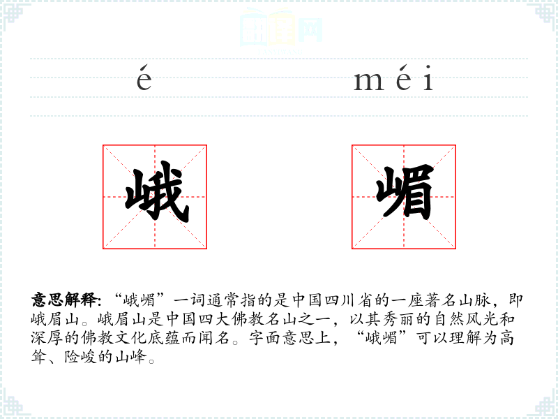 “峨嵋”一词通常指的是四川省的一座著名山脉,即峨眉山。峨眉山是四大名山之一,以其秀丽的自然风光和深厚的文化底蕴而闻名。字面意思上,“峨嵋”可以理解为高耸、险峻的山峰。