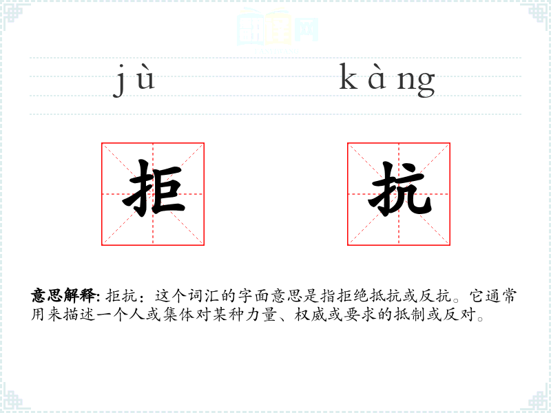 拒抗:这个词汇的字面意思是指拒绝抵抗或反抗。它通常用来描述一个人或集体对某种力量、权威或要求的抵制或反对。