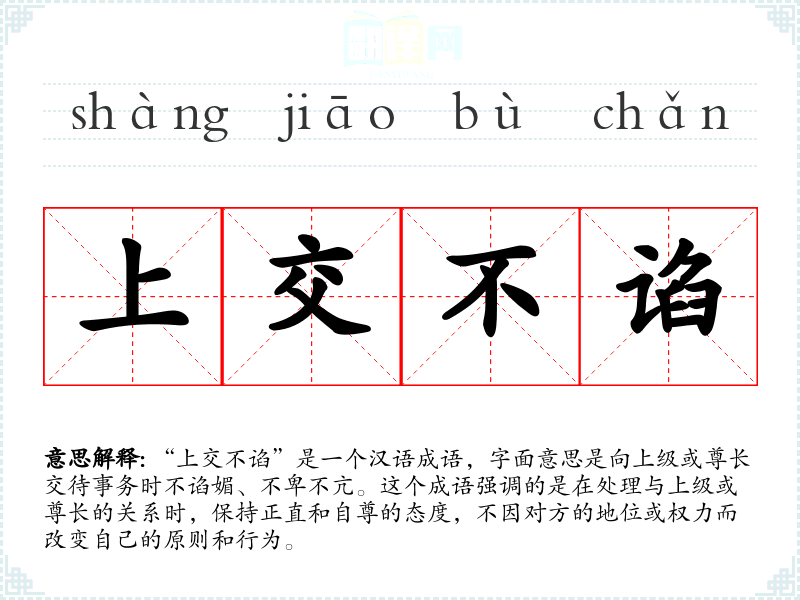 “上交不谄”是一个汉语成语,字面意思是向上级或尊长交待事务时不谄媚、不卑不亢。这个成语强调的是在处理与上级或尊长的关系时,保持正直和自尊的态度,不因对方的地位或权力而改变自己的原则和行为。