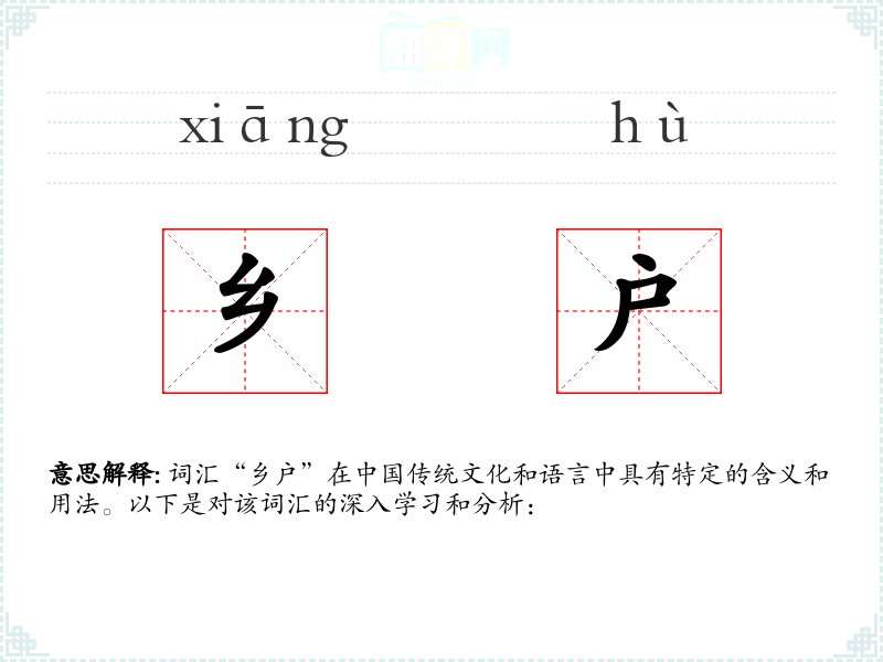 词汇“乡户”在*传统文化和语言中具有特定的含义和用法。以下是对该词汇的深入学和分析: