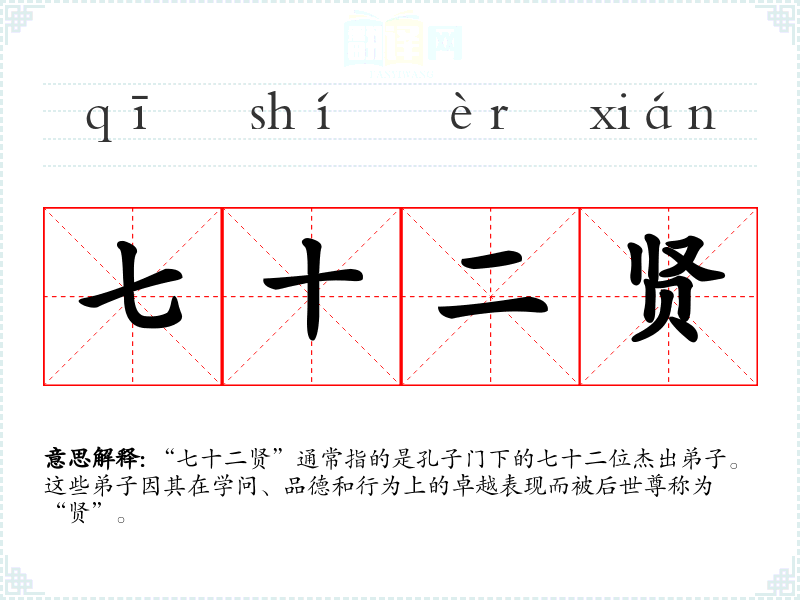 “七十二贤”通常指的是孔子门下的七十二位杰出弟子。这些弟子因其在学问、品德和行为上的卓越表现而被后世尊称为“贤”。