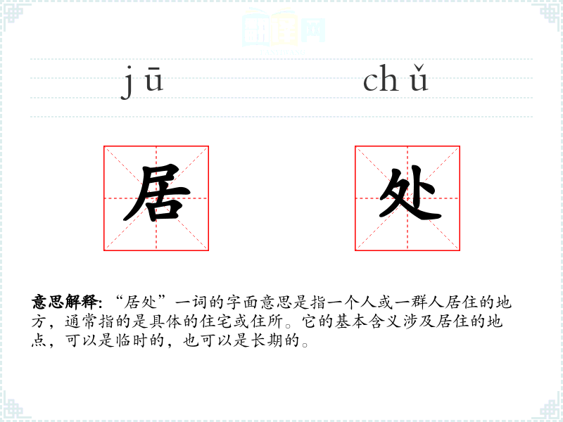 “居处”一词的字面意思是指一个人或一群人居住的地方,通常指的是具体的住宅或住所。它的基本含义涉及居住的地点,可以是临时的,也可以是长期的。