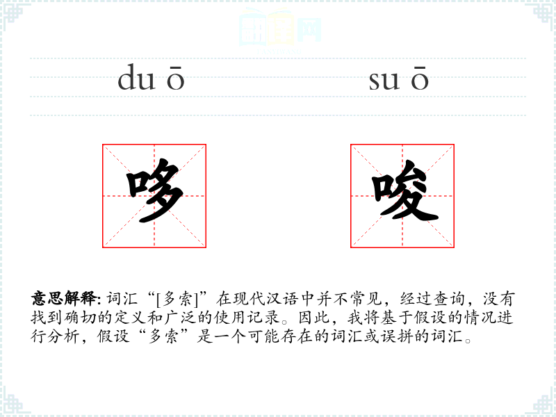词汇“[多索]”在现代汉语中并不常见,经过查询,没有找到确切的定义和广泛的使用记录。因此,我将基于假设的情况进行分析,假设“多索”是一个可能存在的词汇或误拼的词汇。