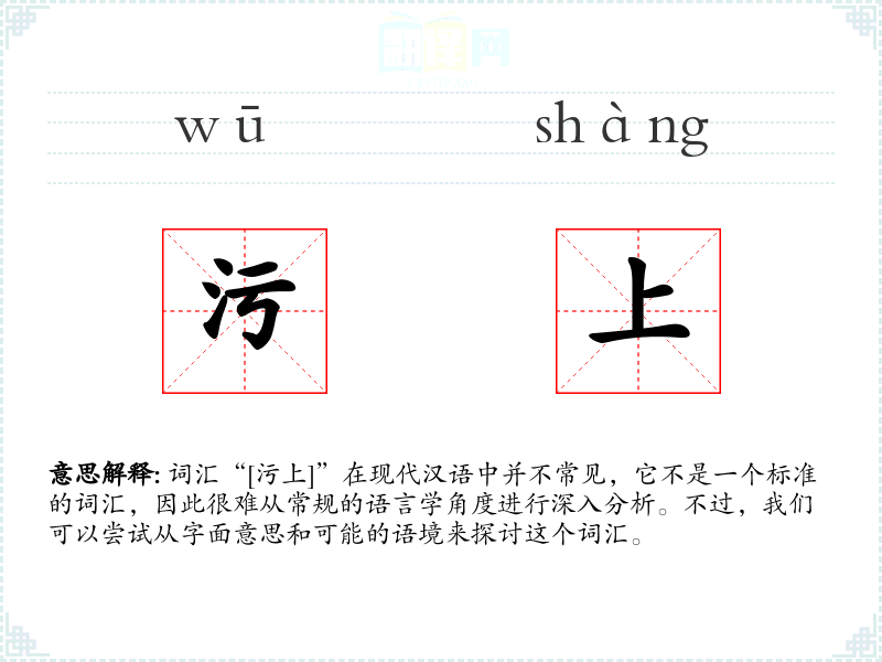 “污上”字面意思可能是指“污染”或“弄脏”某物或某地。由于这不是一个常用词汇,其确切含义可能需要根据具体语境来确定。