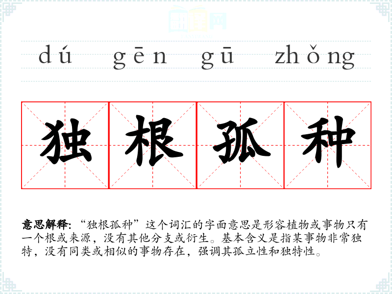 “独根孤种”这个词汇的字面意思是形容植物或事物只有一个根或来源,没有其他分支或衍生。基本含义是指某事物非常独特,没有同类或相似的事物存在,强调其孤立性和独特性。
