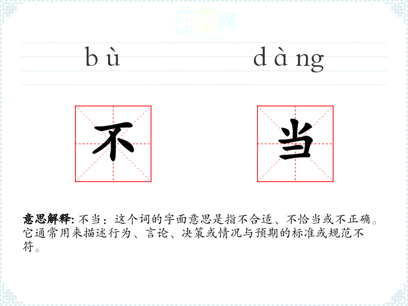 不当:这个词的字面意思是指不合适、不恰当或不正确。它通常用来描述行为、言论、决策或情况与预期的标准或规范不符。