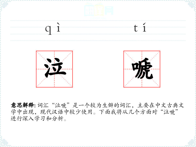 “泣嗁”的字面意思是哭泣、悲鸣。其中,“泣”指的是无声或小声的哭泣,“嗁”则是指悲鸣或哀号。结合起来,“泣嗁”描述的是一种悲痛的哭泣声。