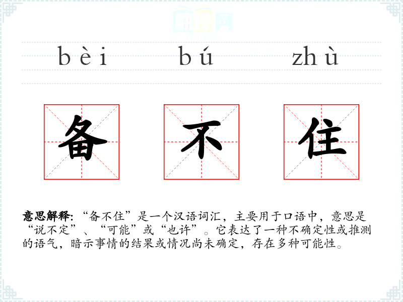 “备不住”的词源较为模糊,可能是由“备”(准备)和“不住”(不停)组合而成,最初可能表示“准备不停”,后来演变为表达不确定性的词汇。在现代汉语中,它的用法已经固定,主要用于口语表达。